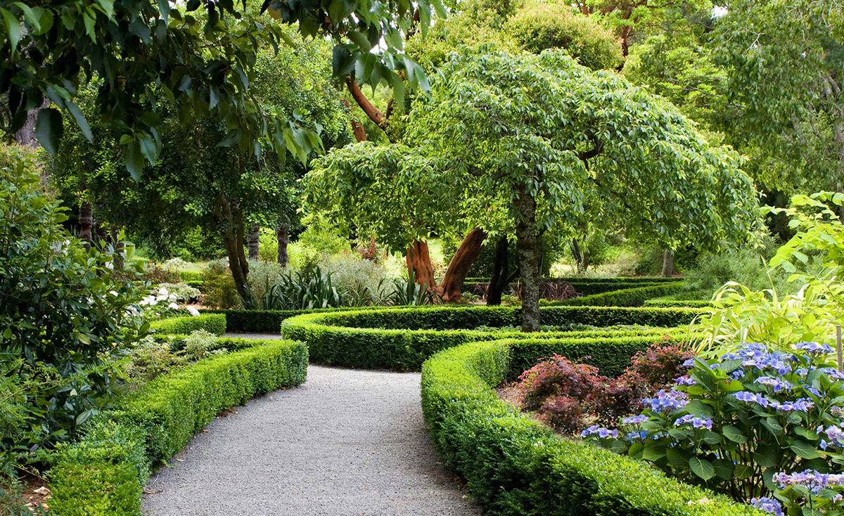 The Dutch garden was renovated in 2007 with the removal of more than 40 trees and the restoration of 6 buxus-lined gravel lanes which radiate from a central circle. Sunlight filters through the canopy of exotic trees planted many years ago which include original oaks, a feijoa and a weeping cherry, which in spring drapes its white blossom over a carpet of vibrant blue ajuga. Elsewhere, a 'Madron Tree' from North America with feathery red bark stands sentinel over drifts of flowering shrubs.