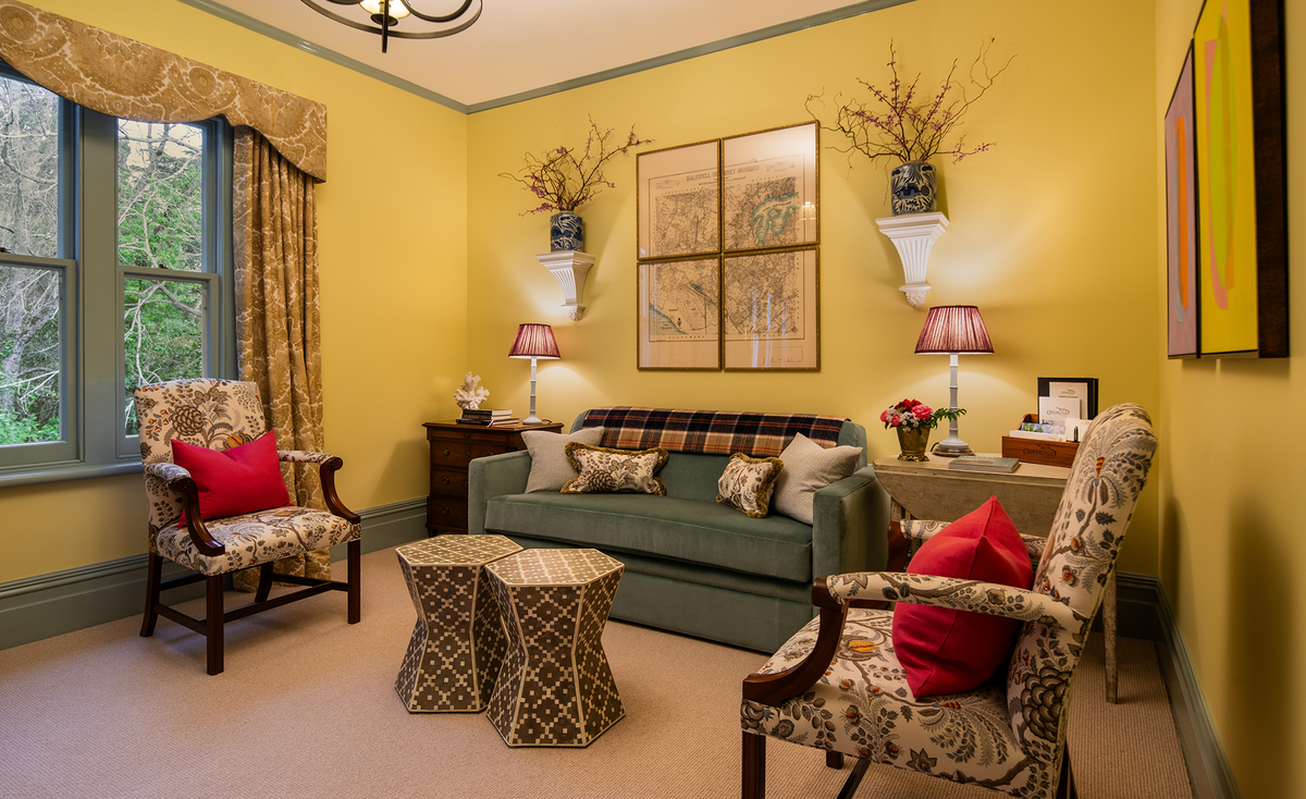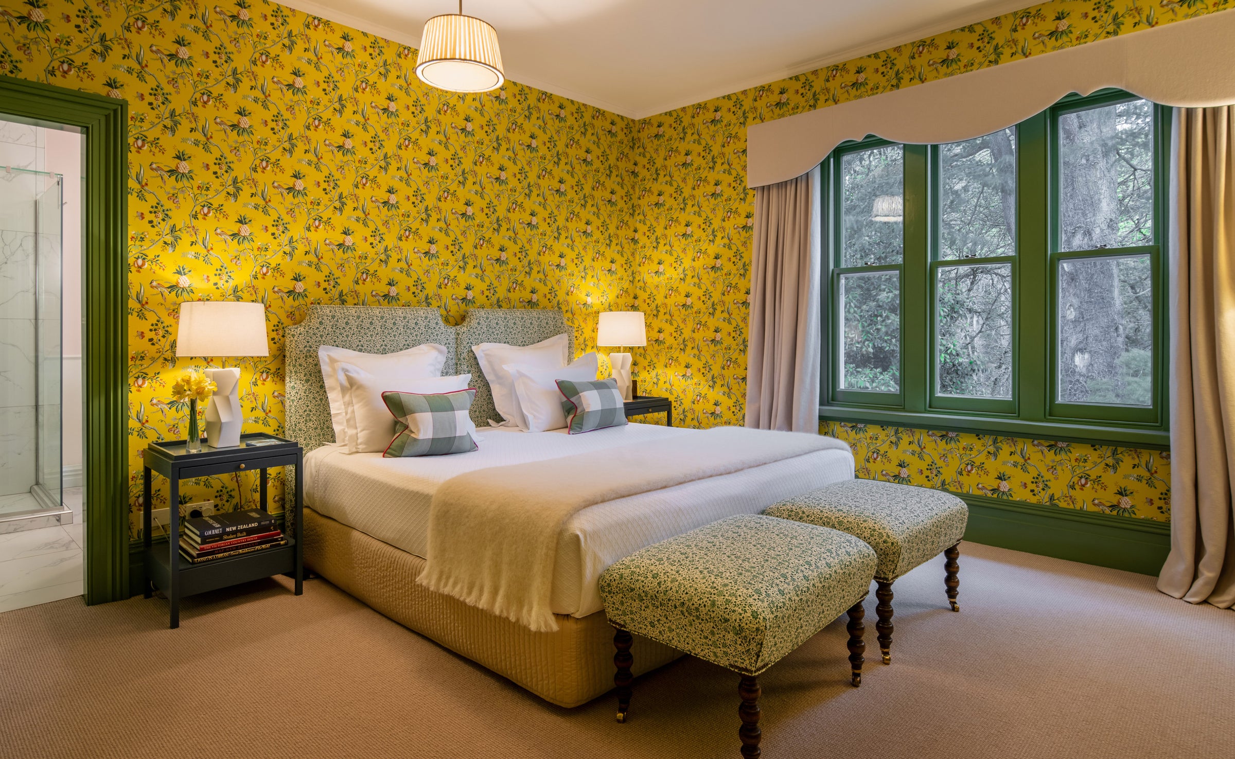 The Jockey Jones Suite represents the culmination of the Otahuna interior aesthetic. This very special collection of rooms overlooks the Herb Garden, the terracotta roof of the Wine Cellar and the Woodland beyond. Inside, discover a bedroom clad in a chic 18th-century Pierre Frey wallcovering, a spacious sitting room with a sofa that can accommodate an extra guest, a striking collection of modern art by two emerging New Zealand artists and the ultimate in indulgence: two separate bathrooms.